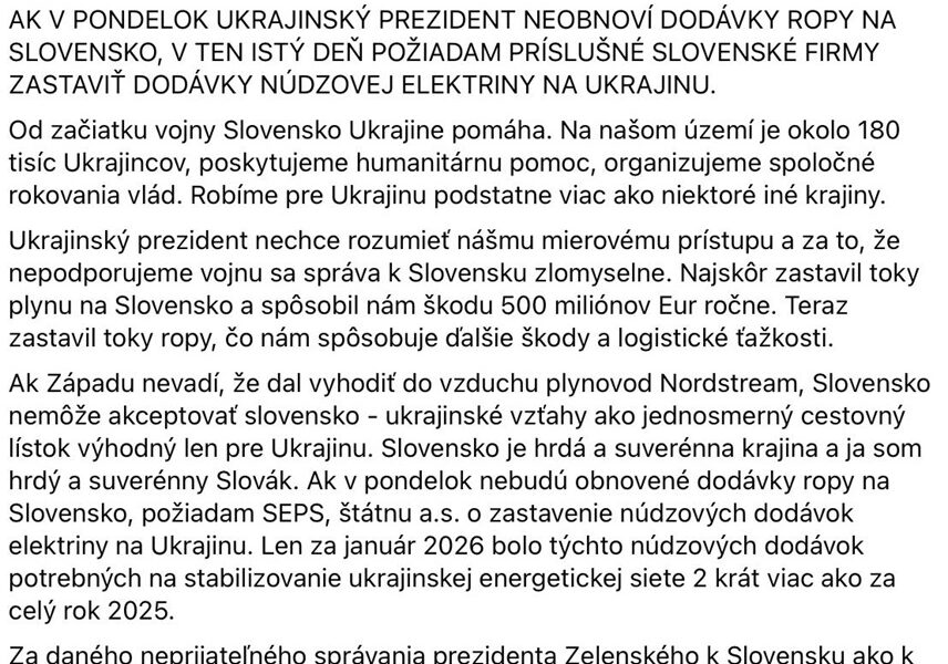 Премьер-министр Словакии Роберт Фицо заявил, что Братислава может прекратить аварийные поставки электроэнергии на Украину, если Киев не восстановит транзит нефти по трубопроводу «Дружба». Срок ультиматума — понедельник. В видеообращении,...